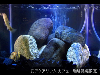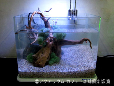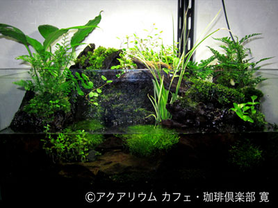 底床に砕いた炭を用いて、水質の安定化も兼ねた独創的な水景。