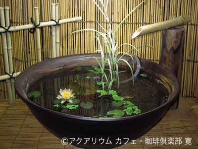 水上部の弧状の流木に、水が伝って流れる計算ずくの水景。
