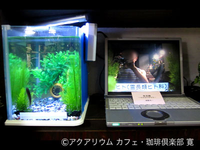 左の水槽を覗くと右の画面に自分の顔が… 魚には貴方がこう見えてます☆
