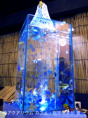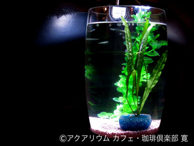 青いガラス細片を入れた小さなガラス椀に細い水草を植えて「逆さクラゲ」!