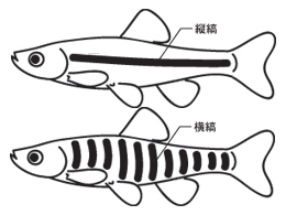魚の場合、頭を上に尾を下にした向きで、縦になるのが縦縞、横になるのが横縞と呼ぶので、頭と尾を水平にした普通の向きでは、縦と横が逆になります(図1)。