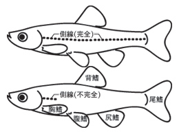 側線とは、頭(鰓蓋)の後方から尾鰭の付け根にかけての、体側中央に一列に並んでいる鱗一枚ずつに開いている感覚器官の穴のことで、一見それらが列なって点線状に見えることから、体側にある線という意味でそう呼ばれています(図2)。