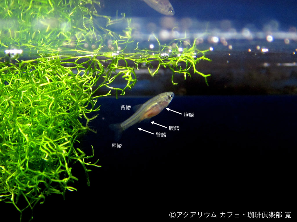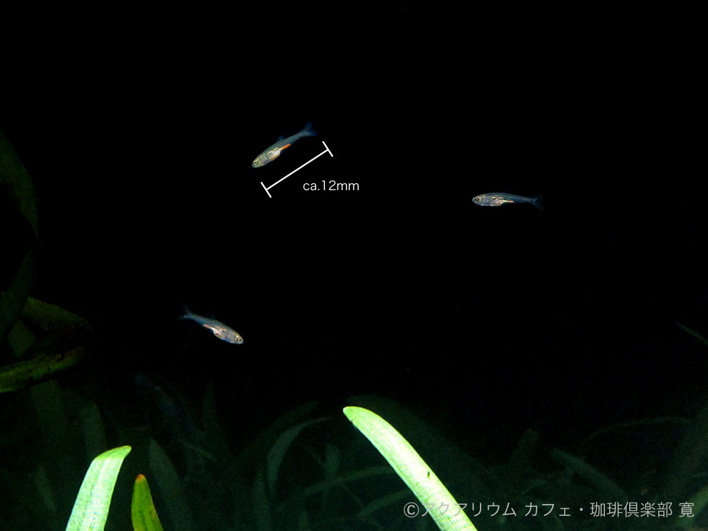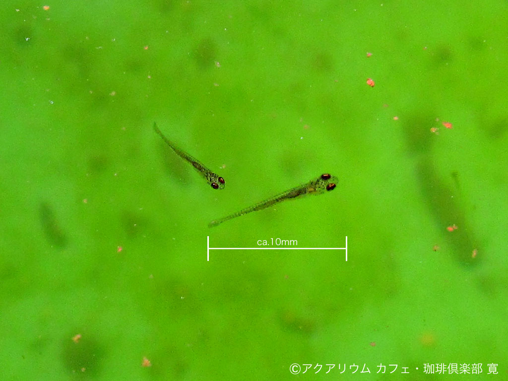 日昼の水温が 22〜24℃の環境だと、受精後 5〜7日で孵化します。孵化直後の仔魚は、全長5mm程度です。