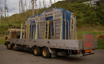 鯨波の御立ち台に写真を撮りにいったときのこと、国道沿いのパーキング(除雪車回転所)に停まっているトレーラーの荷台の荷物をちらっと見たとき「?」、プレハブにしては横長で変だぞ!と思い、帰り際に寄って見たらなんと「いちぶんのいちの鉄道模型の組立てキット」でした(爆)