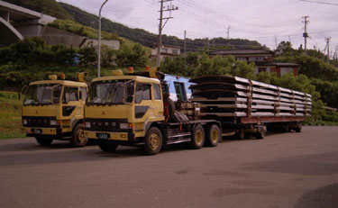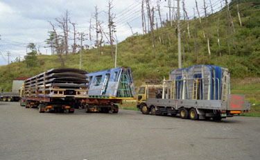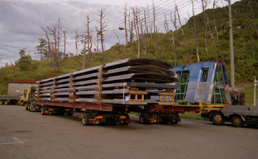 折りしもJR新津車輛所で製造が始まった頃だったので、その部品輸送でしょう。トレーラーは東急車輛の所属(契約?)でした。載せられているのは209系でしょう。しかし、こういうのを見ると乗るのは怖くなっちゃいますね。
