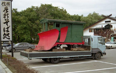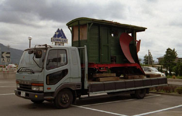 なんだか分かりますか? 頚城鉄道のラッセル車ラキ1です。同鉄道の廃止後、羅須地人鉄道協会の手で糸魚川の東洋活性白土の専用線で保存されていたもので、同線廃止後はこの駐車場の近く「ビレッジ安曇野」で保存されていたもの。羅須地人鉄道協会が成田ゆめ牧場に活動拠点を見出したことから、各地に分散保管されていた協会の所有車を成田に集めようとした時をたまたま見かけたものです。ただ、この写真を撮ったときは事情がわからず(羅須地人鉄道協会の所有の頚城の車ということは知ってましたが)、トラックの運ちゃんに聞こうにも姿が見えず真相はわかりませんでした。ちなみに、左の写真の左奥に写っている車は前の愛車エテルナです。(とれいん 1994年12月号掲載)