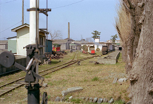 道路を横切り、列車は工場敷地内へ入っていく。柵に見える赤旗は列車が来ることの印か。 工場内を望む 一番右の線に先ほどの列車。その隣は「羅須地人鉄道協会」の客車など、左端に頚城のラッセル(まんま写真館part.2参照)が見えます。