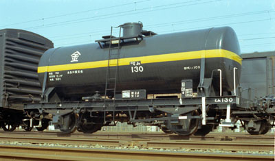 国鉄貨車がら積み替えた貨物(燃料?)を積んだタンク車1輌を従えて2号機関車がやってきた。 バックには北陸線、その向うには明星セメントの工場が見える。