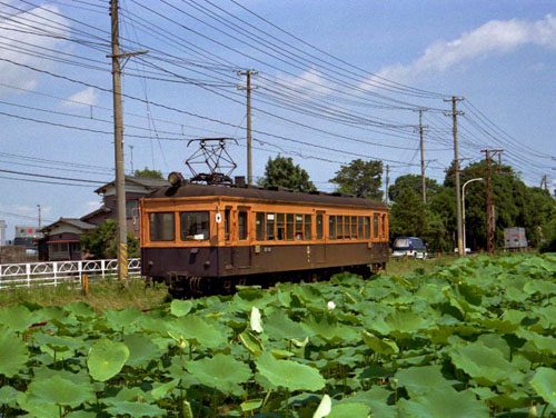 ある夏の1コマ。蓮畑を横に見ながらコトコトと走っていく。 1995-07-23 蒲原鉄道 村松〜今泉 |