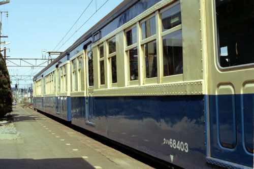 改造車 先頭のクモハ50はクモハ53の3扉化、クハ68はクロハ59の格下げ・3扉化といった具合に、何らかの改造が施されている車輛が大半でした。 1221M 1983/03/15 北殿 |