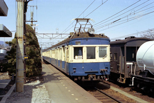 アイドル? 1形式1両の珍車、クモハユニ64です。流電亡き後の飯田線で、「合の子」と人気を二分する存在でした。 隣の貨物列車も気になりますね。また、左隅のタンク車がここでも貨物扱いがあったことを物語っています。 1221M 1983/03/15 北殿 |