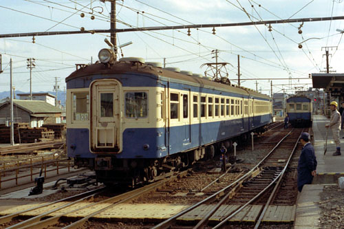 折返し 一部の列車を除き、飯田線の終点辰野が始発・終着となります。 先頭はクハユニ56011 1226M 1982/11/07 辰野 |