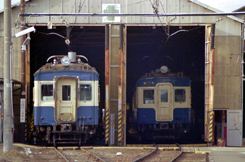 庫から顔を覗かせる整備中の車輛たち。 クモハ61(左)・クモハ54(右)か? 1983/03/15 伊那松島機関区 |