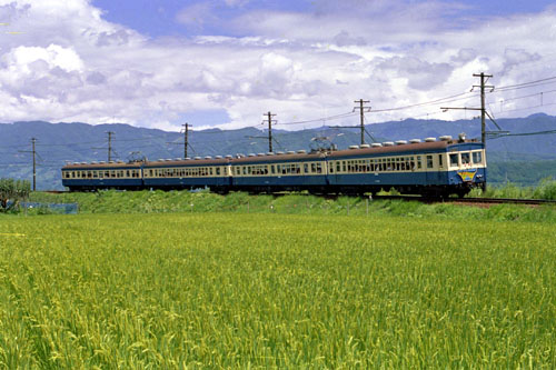 この列車、途中(七久保)で長時間停車が設定されており、上の撮影地で撮影後、徒歩で上片桐に移動後、列車で追っかけができました。 1983/08/20 駒ヶ根 |