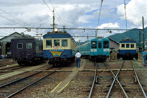 伊那松島に到着後、機関区内において撮影会が催されました。 さよなら列車は編成を分割のうえ展示されていました。 1983/08/20 伊那松島機関区 |