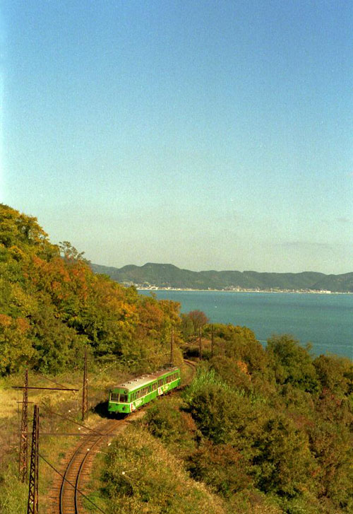 琴海駅を出発するメリーベル号 このすぐ山手にJR瀬戸大橋線が走っており、その車窓からも眺めることができた。いまでも、その廃線後を確認することができる。 1990-11-24 下津井電鉄 琴海 |