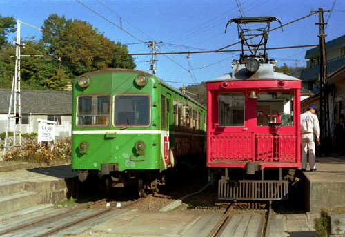 下津井駅で並ぶ緑のクハ103と赤い「メリーベル号」2000系 メリーベル号は、瀬戸大橋開業に合わせ観光の目玉にと新製されたオープンデッキをもつ観光用電車。 1990-11-24 下津井電鉄 下津井 |