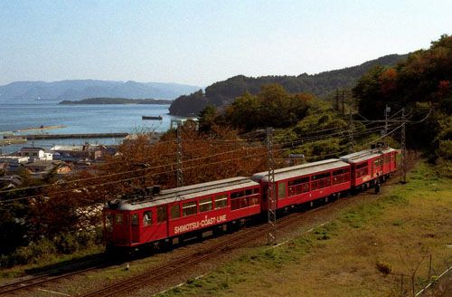 鷲羽山の麓を行く モハ1001と共に主力として活躍してきたモハ24+クハ103。 末期には富士カラーの全面広告電車になっていた。 1990-11-24 下津井電鉄 琴海〜鷲羽山 |