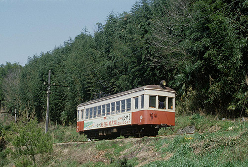 野鉄で一番新しい?元富山地鉄車。デ13。 このようなかわいらしい車輛達の宝庫であったことが野鉄の最大の魅力でした。 1989/03/12 野上電気鉄道 竜光寺前〜下佐々 |