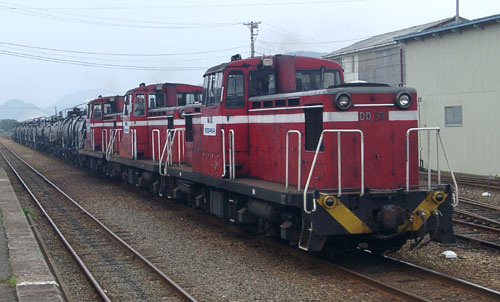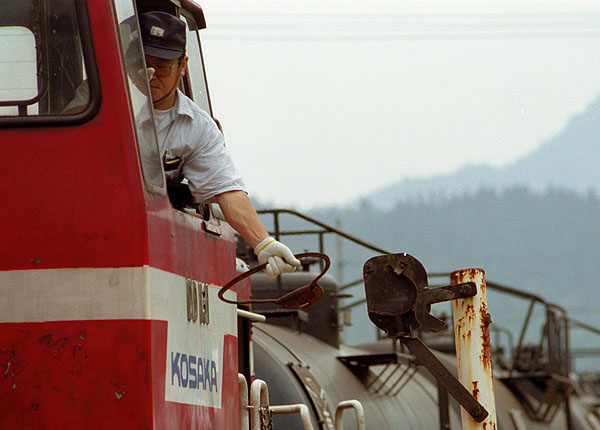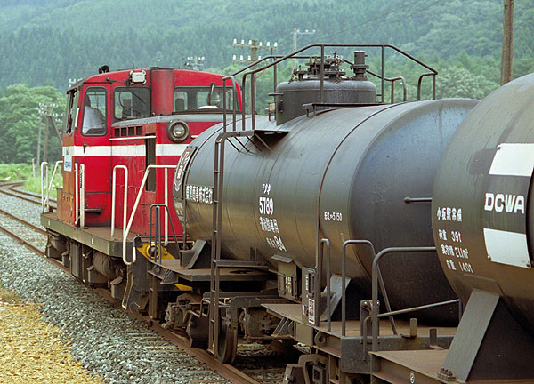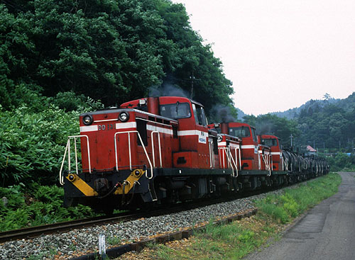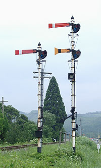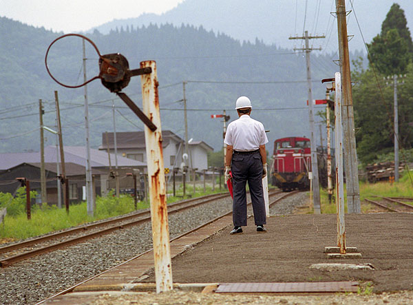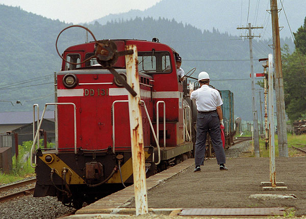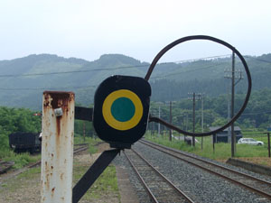 小坂を出た貨物列車は、ここから茂内に渡って続く急勾配に対応するために1〜2輌の補機の連結をします。茂内を出るときつい勾配は無いので、補機はここで開放され小坂へと戻って行きます。一方、大館より出た貨物列車は、そのまま小坂を目指します。途中、ここ茂内は通過です。そのときに走行中のタブレット授受を見ることが出来ます。