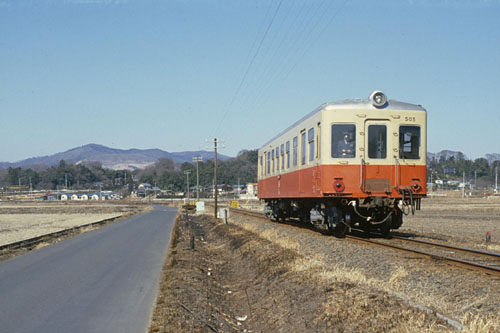 筑波山を目指して。 やはり筑波山を絡めた写真を撮りたくて、土浦方に移動。「蝿たたき」があった関係でこんなアングルに。 車輛はキハ505。自社(常総筑波鉄道)発注車で、当時では画期的なエアサス付き総括制御車であった。 1986/02/12 筑波鉄道 常陸藤沢〜坂田 |