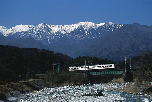 2001/04/01〜05/15 残雪の中央アルプスをバックに中田切川を渡る119系。 この119系にも313系への置換えの噂が・・。 1998/04/04 田切〜伊那福岡 |