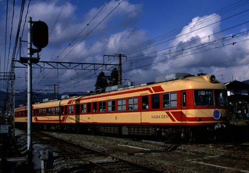 2001/01/01〜03/03 写真では分からないかも知れませんが、下り本線を通過し渡り線を通り上り本線へ進入する特急です。直後のダイヤ改正で見られなくなりました。 1999/12/04 長野電鉄 朝陽 |
