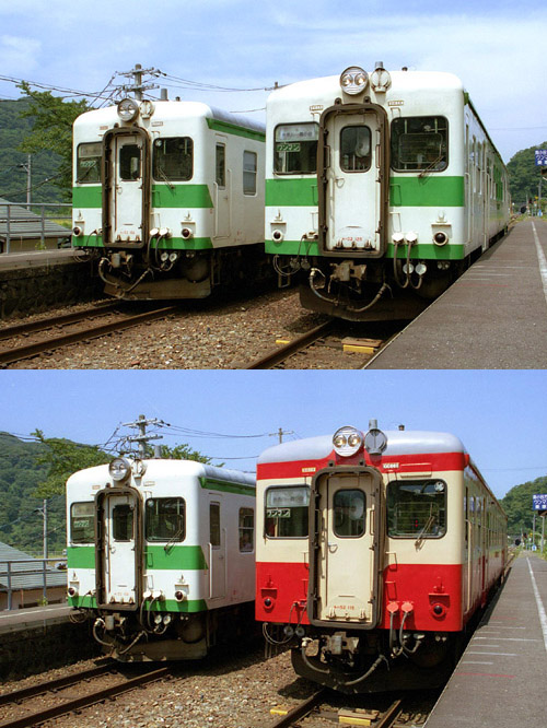 2004/08/08〜2004/10/29 427D・428D 根知並び 今年8月より大糸北線のキハ52の1両が国鉄色に。急に鉄道ファン注目の路線になってしまいました。 撮影に行っても、今までは誰とも会わなかったのですが、今では撮影者の姿を見かけない日は無いぐらいです。 もう1両が首都圏色に塗り替えられると、同色並びも貴重になります。 2004/08/01(上) 2004/08/13(下) 根知 |