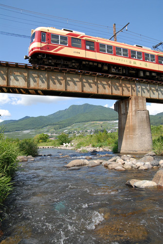 2007/07/31〜2007/12/30 涼を求めて 夜間瀬川橋梁は色々なアングルが楽しめます。この時は、水面ギリギリにカメラを構え、水の流れと橋の下からの高社山の眺めを絡めて見ました。 2006/09/03 長野電鉄 信濃竹原〜夜間瀬 |