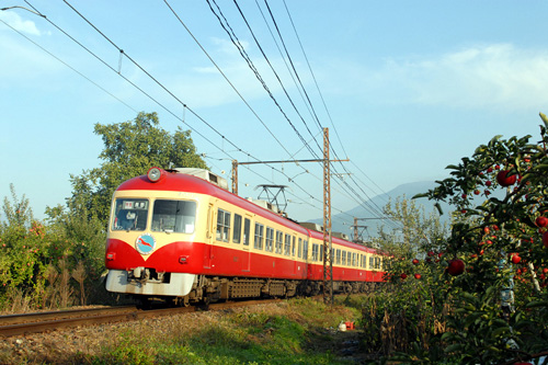 2009/09/12〜2009/12/26 リンゴの実る頃 リンゴ色にはリンゴの実が良く似合う。 あと何回、この組合せが見られるのでしょうか。 2008/10/13 長野電鉄 上条〜夜間瀬 |