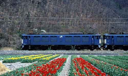 2002/03/28〜2002/06/24 チューリップ畑を行くEF64 更埴はチューリップの栽培の盛んなところですが、線路沿いの畑は僅かです。 1999/04/17? しなの鉄道 屋代〜戸倉 |