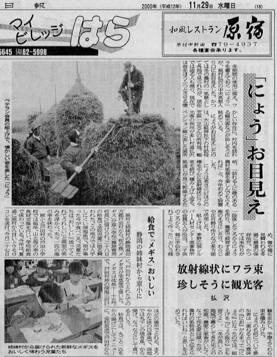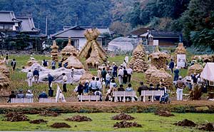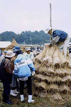 安心院町の藁こづみ大会が、平成居12年11月11日(土)に開催されました。 正調こづみ、創作こづみの2部門に各10チーム、計20チーム。 見物人を入れて400人ほどが参加。 当日を紹介する安心院町のウェブページ島根県温泉津町と愛媛県宇和町もゲスト参加し、計23基(藁こづみの数え方は?)が2時間ほどで積まれました。 |