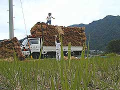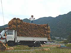 トラックの上では丁寧に藁を並べていく | |