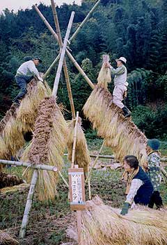 島根県温泉津町「ヨズクハデ」と呼ばれるもので、稲の乾燥用のハゼ干し (温泉津ではハデと呼ぶそうです)です。ヨズクは「みみずく」「ふくろう」 の意味だそうで、できあがった形は確かにふくろうのようにも見えました。 当地でも、もう姿を消し、積める人もわずかになったそうです。いまでは保 存会が活動しているとか。 ![]() できあがった形は確かにふくろうのようにも見える。