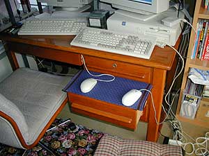 - 2ヶ月前安売りのマウスパッドを買って来たがもう表面が剥げた、このページで紹介しているマウスパッドの桐板製の台(三輪そうめんの蓋)に、貰い物のハンカチでカバーを作り50×20センチの特性のマウスパッドを作る、非常に便利。ハンカチをしっかり伸ばし裏側はガムテープで止めてます。