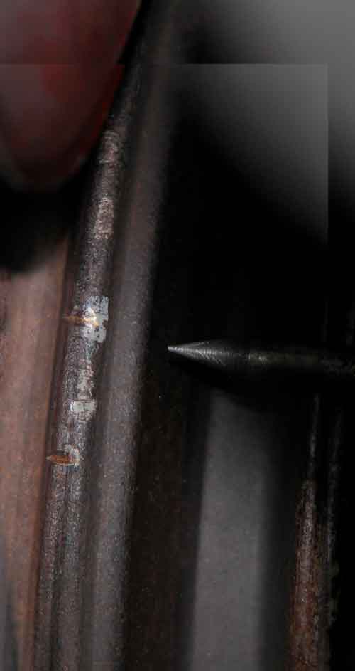 プラグを外した序に上死点マークを確認する、ピストンの上死点で1番は正常、後で付けた2番も正常の位置に印がある。切り込みが1番、白いマークが後付け2番マーク。2枚の写真を重ねて確認、アドビフォトショップは便利なソフト。