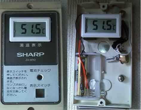 分解したままセンサー部の抵抗を計ると、マイナス14.8度の冷凍庫では49kオーム、室温26.5度で9.23kオーム、59.5度の温水では3.194kオームと温度が高くなるほど抵抗値は低くなる。その回路に直列に抵抗を入れると表示温度が下がり理屈通りだ。