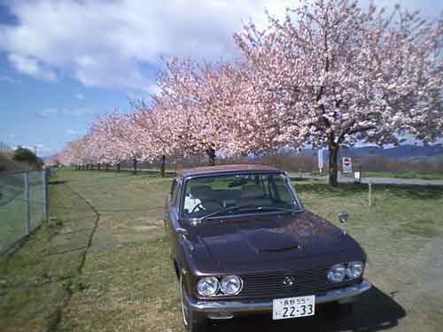 帰りに千曲川の堤防の桜を見に行き満開の桜とルーチェの写真を撮る、高速道路脇に4kmの桜並木が続く、堤防道路は歩行者専用4kmを歩けば往復2時間弱の散歩。