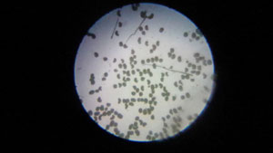 車の上に積もった黄色い物質を顕微鏡で見る、プレパラートの下からの通常観察では角のない黒い米みたいな形で上から光を当てると白い米粒の様に形が揃っているが、中には勾玉の形や直角にひねれた粒がある