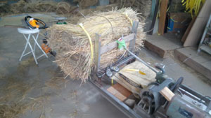 下の写真は最初に作った藁締め機で、昔オール藁畳1枚35kg6枚を公団住宅4階まで上げる力を持つ機械を改造して藁締め機を自作。