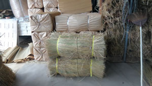 絞める前>絞めてバンドで固定>この後包装紙で包んで宅配藁15kg完成、後ろに見える完成品