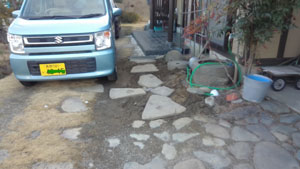 先日直した玄関への飛び石がしっくりいかず多少並びを直す、高さも1センチほど上げて、左右どちらから踏み出しも意識しなくて自然に歩ける