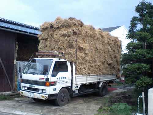 - 稲藁を超満載に積んだトラックが走る、すれ違う車の人は驚きの表情がありあり。日通コンテナターミナルで4トンウイング車に積み換え発送。